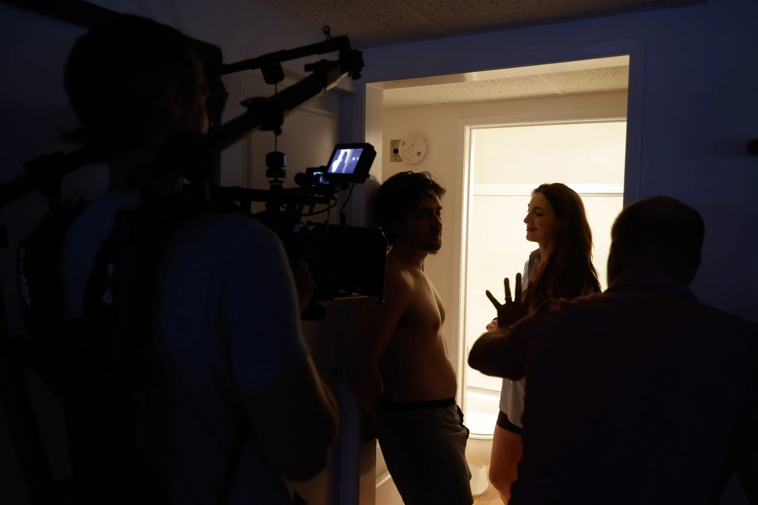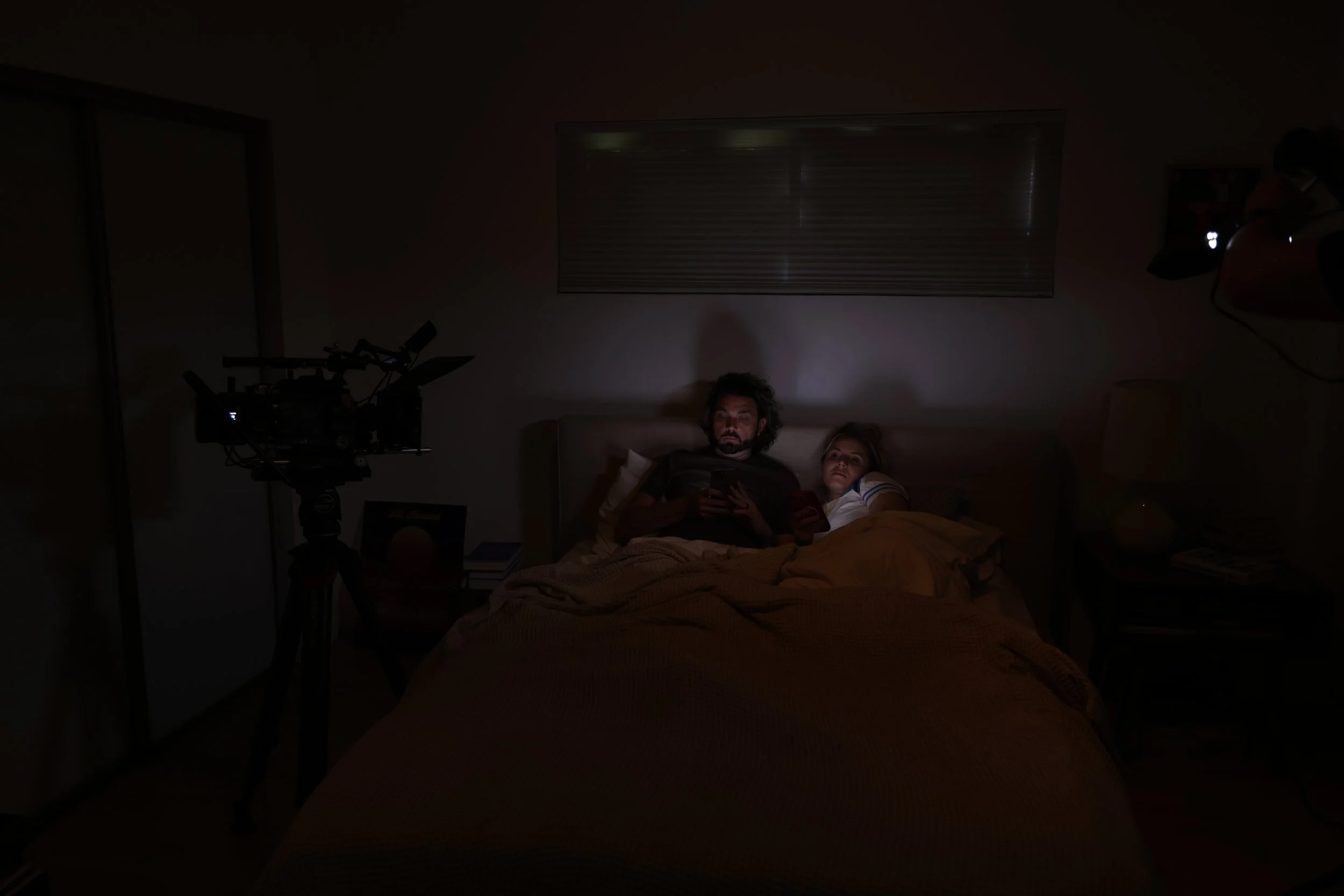 Magical things happen on set when everyone is working in sync. Because we were locked into shooting in bedrooms, we had to look for new ways of shooting and expanding how bedrooms found their way into our movie. Here, actress ELYSE BRANDAU, was doing her Hair and Make-Up in the master bedroom’s bathroom mirror while our DP Steven Paul was setting up his ready-rig and lights. He accidentally stumbled upon this moment, capturing an unintended lighting situation, framed by a doorway and we immediately threw out the shotlist and did the scene exactly how you see it here.